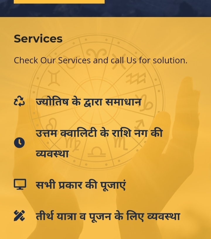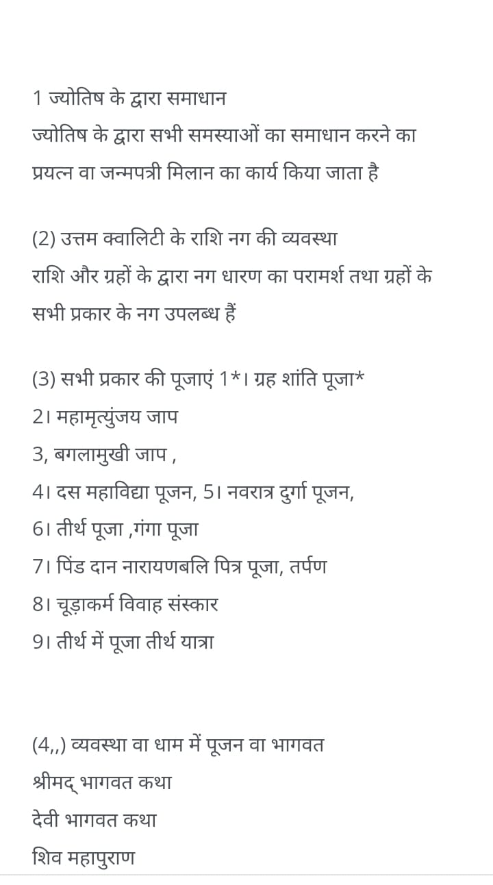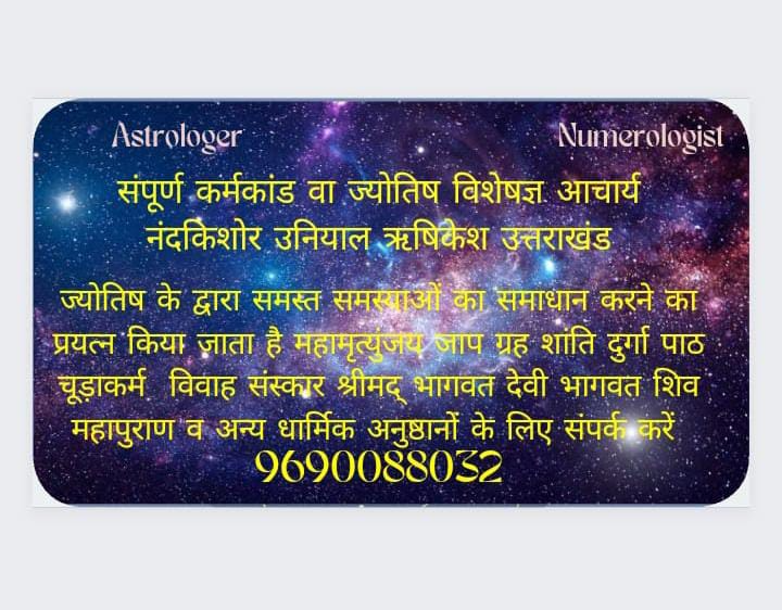 Meet our expert Astrologer Acharya Pandit Nand Kishore Uniyal Ji who brings a wealth of knowledge and experience to the table. With 10 years of experience in the field, they have mastered the art of astrology and can provide you with accurate readings and insightful advice. So, if you're looking for a compassionate and knowledgeable astrologer to guide you on your journey, look no further. Our astrologer is here to help you unlock the mysteries of the universe and discover your true potential. ACHARYA Nand Kishor Uniyal 31 ALL KINDS OF POOJAS Acharya Nandkishore Uniyal Complete Ritual Specialist Complete Worship Lesson Home Jap Chudakarma Marriage etc. 16 Rituals Matching or Birth Certificate Consultation of the Planets Peace of the Planets Planet Dosh Pitra Dosh Dev Dosh Bhoot Badha Haak Tok Nazar Dosha Kiraya Graha Kalesh Vaastu Contact Do Acharya Nandkishore Uniyal Devbhoomi Rishikesh. We will serve with any kind of pooja in Rishikesh and Haridwar. We also provide Virtual Pooja through video calling if anyone not able to join Physically:
