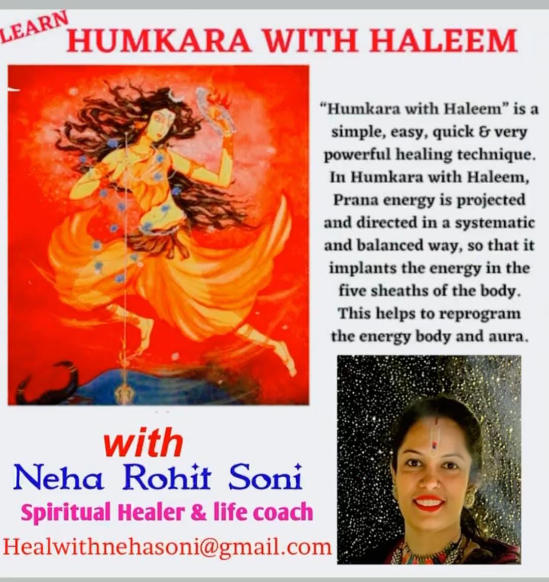 Meet our expert Humkara with haleem healing expart Nneha Rohit Soni, who brings a wealth of knowledge and experience to the table. With 2 years of experience in the field, She has mastered the art and can provide you with accurate readings and insightful advice. So, if you're looking for compassionate and knowledgeable guidance on life , look no further. Humkara with Haleem is a simple, easy, quick & very powerful healing technique. In Humkara with Haleem, Prana energy is projected and directed in a systematic and balanced way, so that it implants the energy in the five sheaths of the body. This helps to reprogram the energy body and aura.